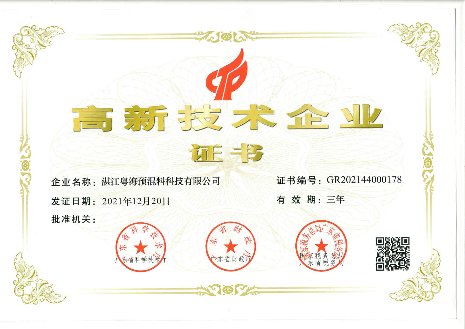 高新技術(shù)企業(yè)證書(shū)-預(yù)混料